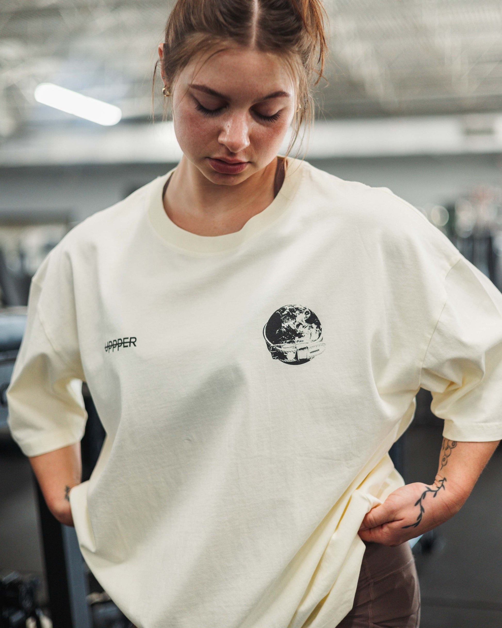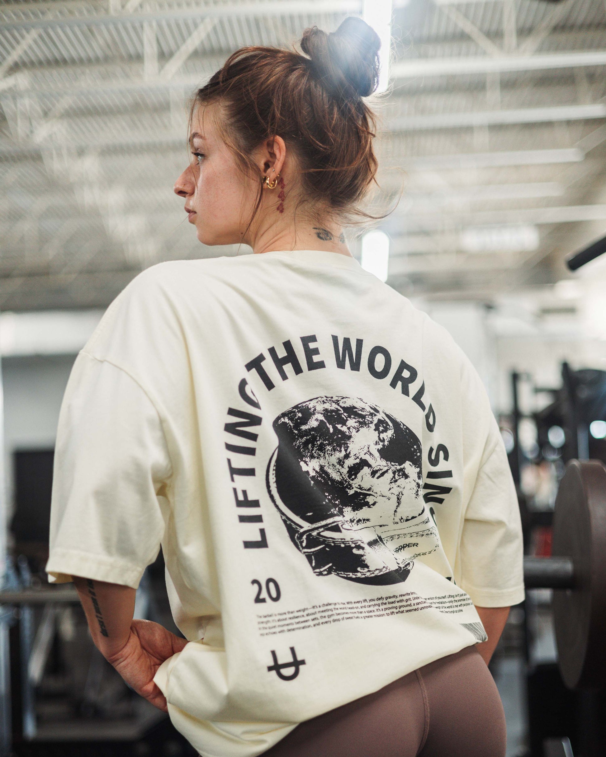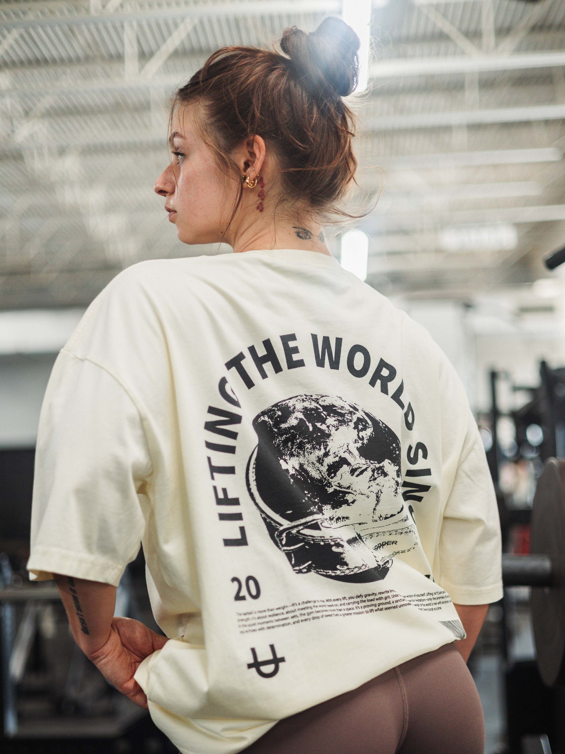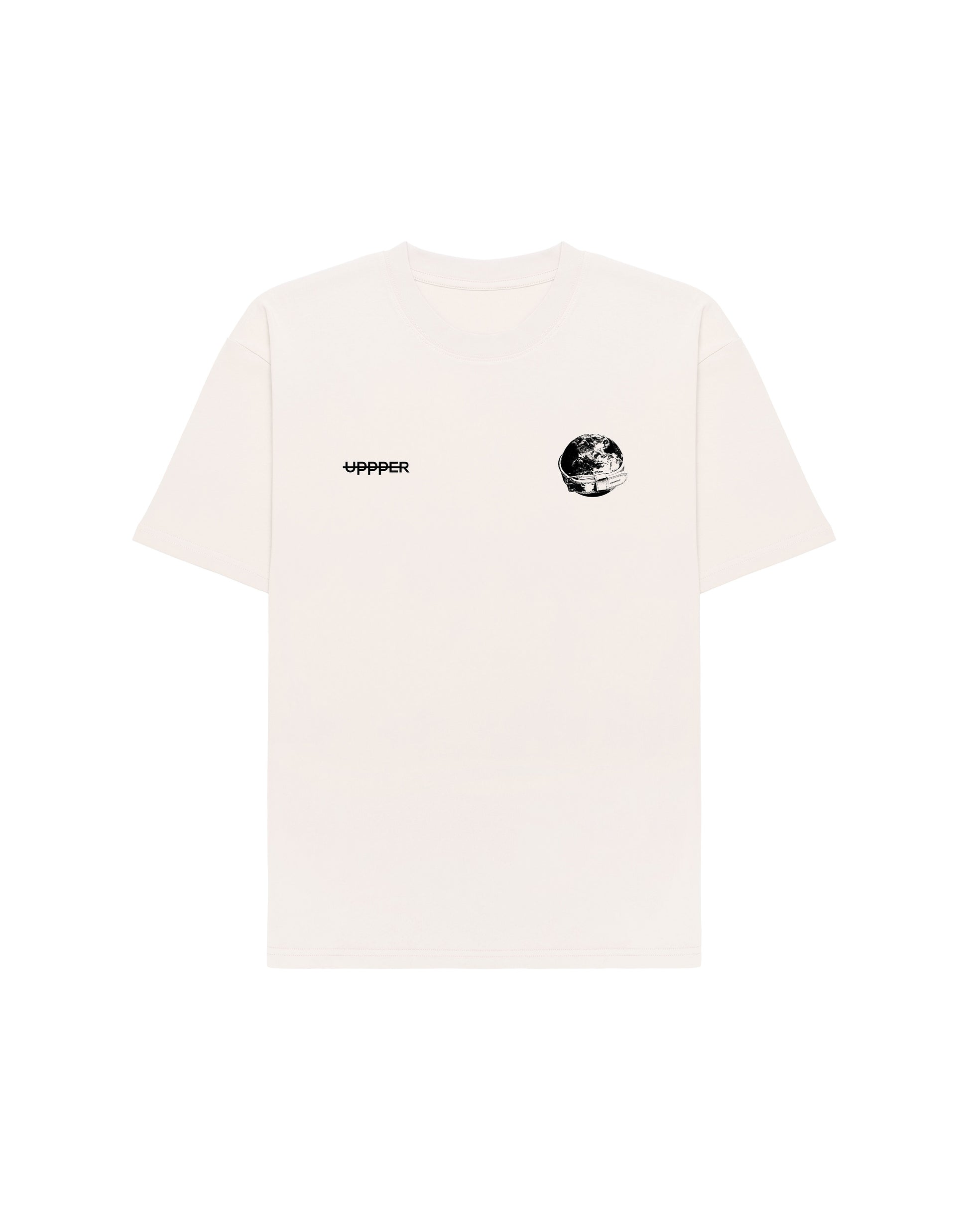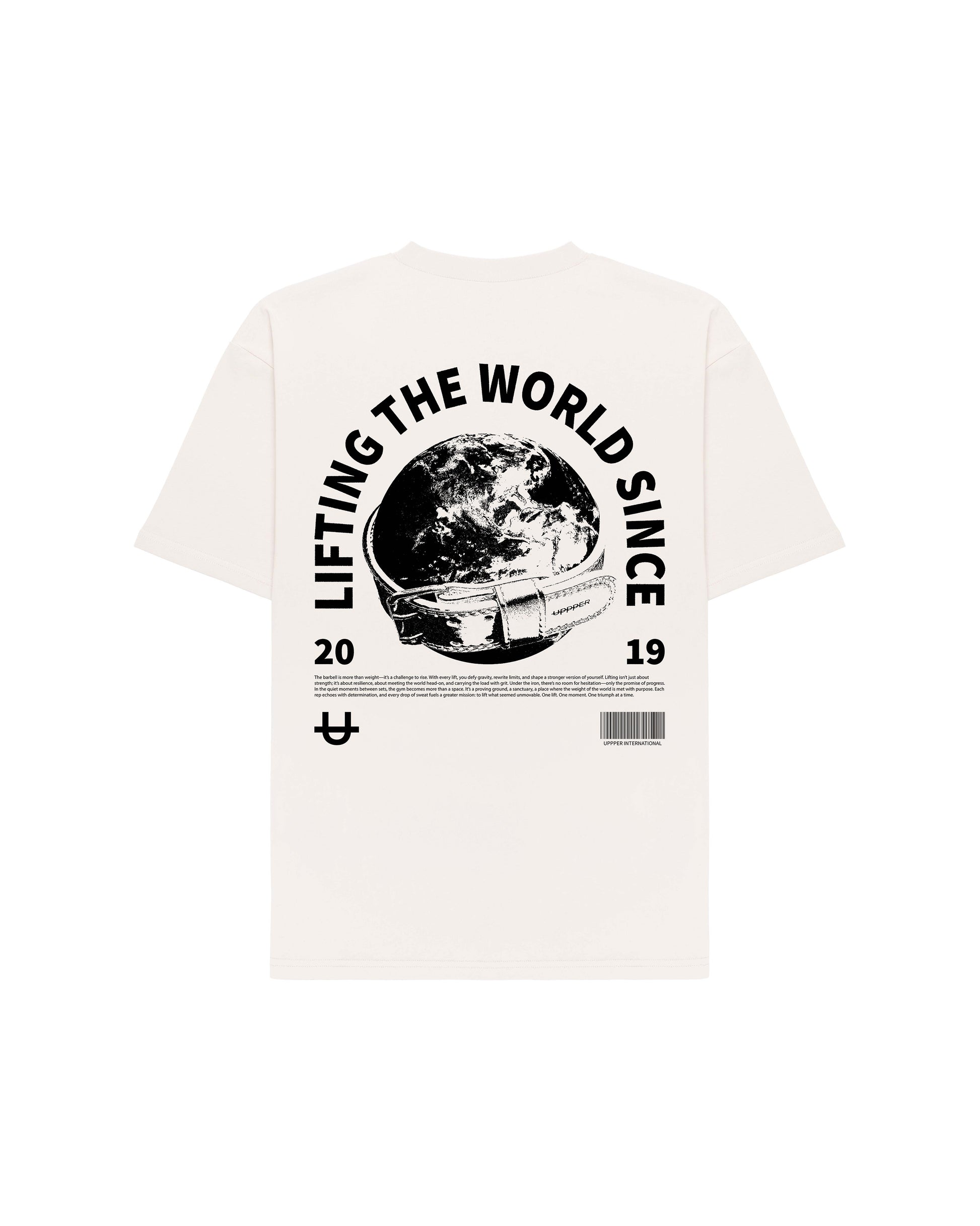 Embrace the power of purpose with UPPPER's Lifting The World T-Shirt. This creamed-colored t-shirt features a striking black print on the back, showcasing the iconic UPPPER Belt around the world—a symbol of strength, resilience, and unyielding determination.
